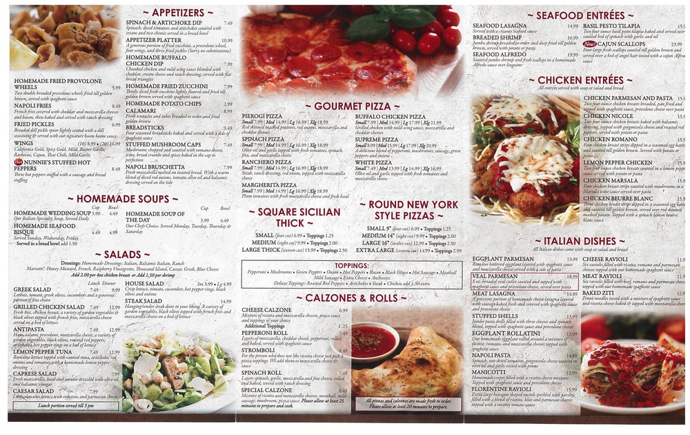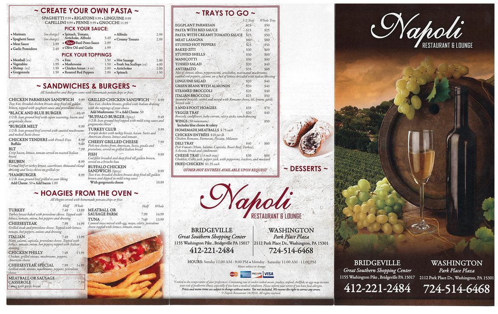 Napoli Restaurant, located in Bridgeville, PA, offers a diverse menu of delicious Italian dishes, including pizza, salads, and appetizers. The restaurant provides a range of amenities, such as delivery, takeout, and reservations. The appetizers, like the breadsticks and buffalo chicken dip, are flavorful and satisfying. The salads, particularly the grilled chicken salad and steak salad, are fresh and filling. The pizza options cater to all preferences, from small thin-crust to large thick-crust pizzas. Customer reviews highlight the excellent service and generous portion sizes. Overall, Napoli Restaurant is a great spot for a casual meal with friends or family, offering a variety of tasty options in a cozy atmosphere.