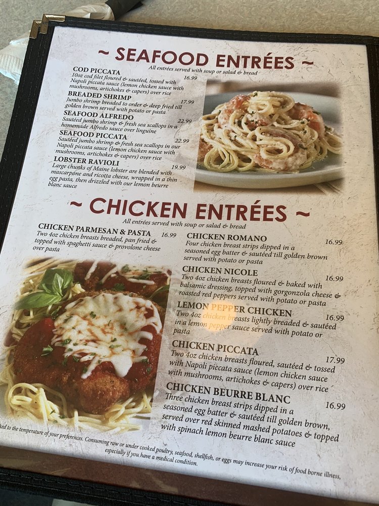 0oz cod filet floured & sauted, tossed with Napoli piccata sauce (lemon chicken sauce with mushrooms, artichokes & capers) over rice.